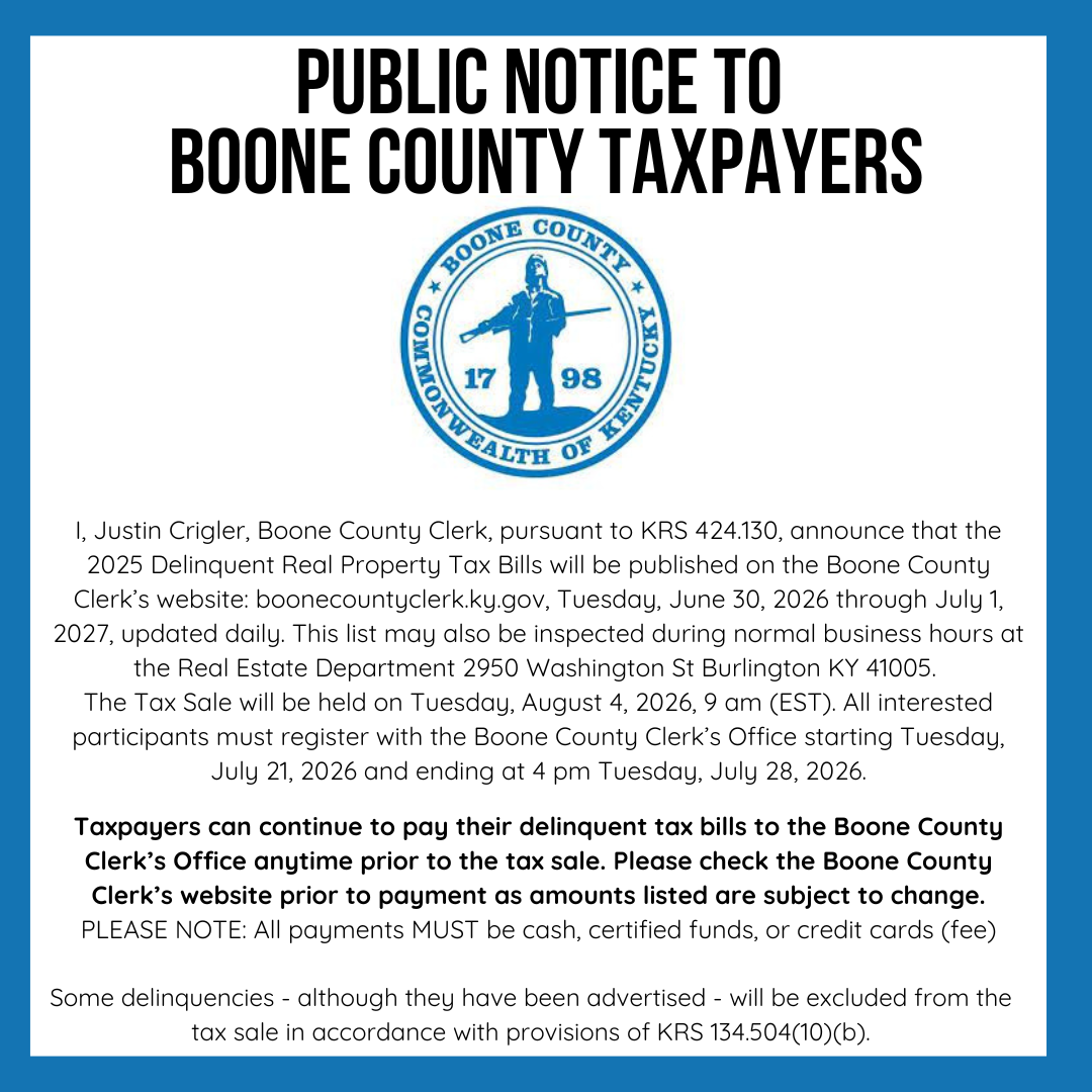 PLEASE NOTE: Our office CANNOT accept partial payments on delinquent tax bills. If you are unable to pay your delinquent tax bill in full, you may call the Boone County Attorney’s Office to set up arrangements at 859-334-3200.